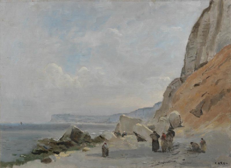 The French artist Camille Corot painted this coastal view on the beach at Yport in Normandy in July 1872. First he drew the most important contours on the canvas, and then painted the beach, cliffs, sea, and sky in one go. He only added the figures in the foreground later, back in his atelier.