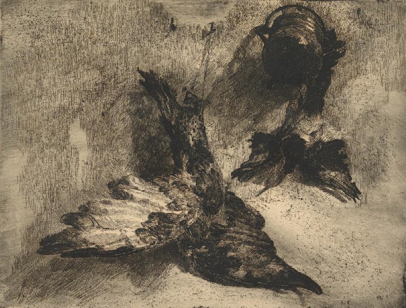 What is impressive is the deep black that Van Houten was able to achieve in her etchings—not ‘dead black but a living darkness’, wrote an art critic in 1923. Even in the darkest areas, the individual black lines remain visible, like tangible threads resting on the paper. At times, she ventured beyond the limits of the material, creating paler areas of light, as on the right wing of the large bird.