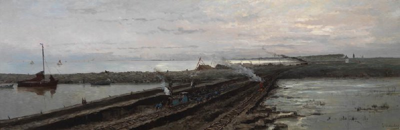 Mesdag became known primarily for his depictions of the life of fishermen and of ships at sea. Quite exceptionally he chose a topical subject for his Building the New Harbour Works in Enkhuizen. Here he painted the construction of the rail link between Enkhuizen and Amsterdam and the associated harbour works for the ferry to Stavoren.