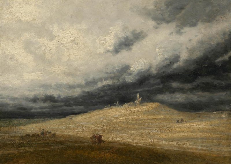 This expansive landscape with a lowering thundery sky recalls 17th-century landscapes by Jacob van Ruisdael. Georges Michel was probably very familiar with such works because he restored paintings in the Louvre. The dramatic illumination in this painting can be compared to that in Ruisdael’s Le coup de soleil, which had been in the museum’s collection since 1784.