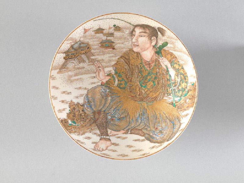 Dish decorated with seated Ōta Dōkan and castle towers in the background