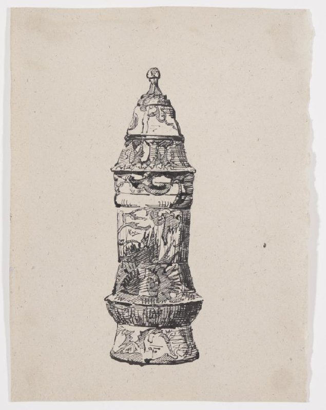 In 1888, Van Houten made drawings in pen and ink of objects from the Mesdag collection. She made this drawing of the covered vase of the Day and night. It featured in the article about the Haagsche Plateelbakkerij Rozenburg. It was probably commissioned by the Mesdags as a way of supporting their niece while also promoting the museum. Van Houten's drawing is free and sketch-like in nature; not every detail is worked out.