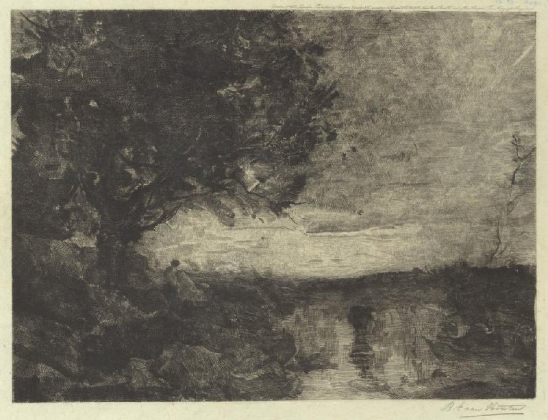 This etching, based on a painting by Camille Corot, is part of a series. After completing her studies at the Rijksakademie in Amsterdam, Van Houten proposed to the Mesdags that she make reproduction etchings of French paintings in their collection. With their support, and in collaboration with the Parisian publisher Boussod, Valadon & Cie., a luxury portfolio containing six etchings was published in 1886. This special edition immediately gave her international visibility as an up and coming artist.