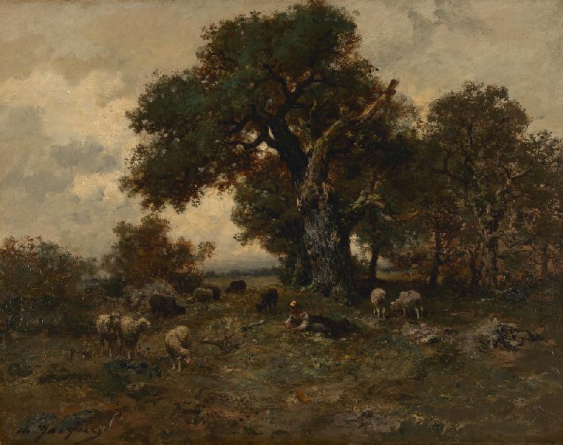 Aan de rand van het bos graast een kleine kudde schapen. Een oude, halfdode eik torent boven hen uit. Zo’n onderwerp is typisch voor Jacque, die vanaf 1849 in Barbizon woonde. De schilder staat bekend om zijn toegankelijke onderwerpen: een weide, een herder en een kudde schapen.