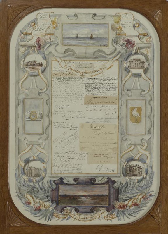 Blad met gelukswensen en decoratieve omlijsting van cartouches met voorstellingen, onderdeel van het kamerscherm aangeboden aan Samuel van Houten ter gelegenheid van zijn zeventigste verjaardag